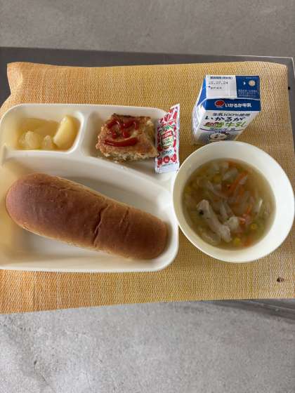 ツナポテトオムレツは、ツナとゆでたじゃがいもと液卵を混ぜ合わせたものを蒸し焼きにして作り、ケチャップをつけていただきました。今日も大変好評でした。