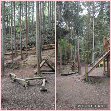昼食を食べ終わり、登山前にアスレチックを楽しんでいます。