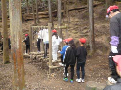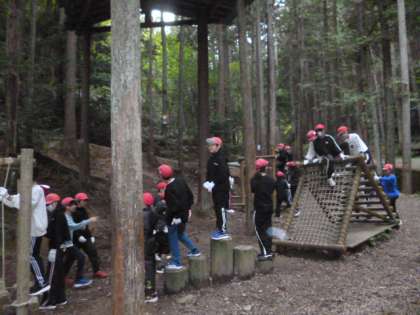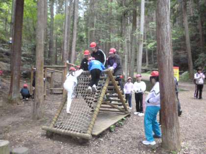 登山の前に野外アスレチックで楽しく過ごしている様子です。