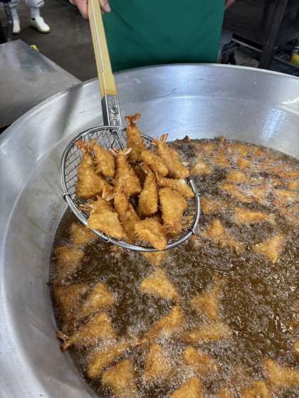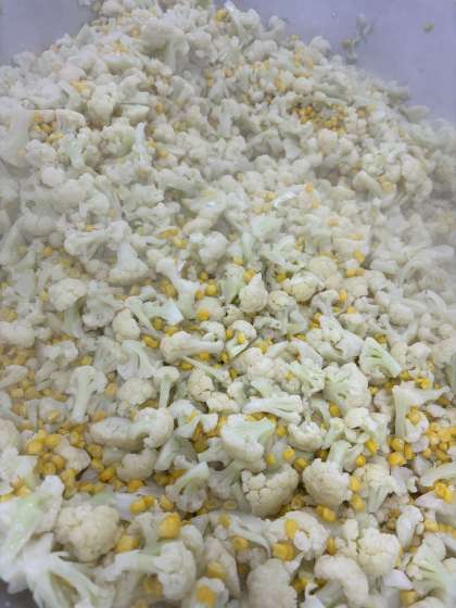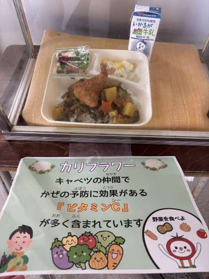 カリフラワーは、11月から3月頃が旬の野菜です。熊本県、茨城県、愛知県などでたくさん作られています。コーンとピクルスにしていただきました。エビフライカレーライスは、カリッとあがったエビフライをのせたカレーライスで大好評でした。