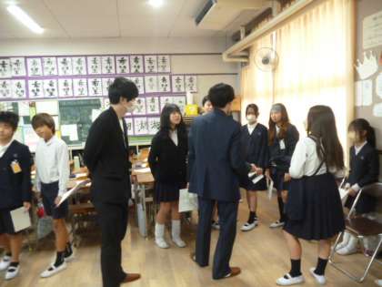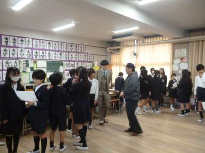 はじめは、緊張気味の児童もいましたが、放送作家さん、満丸さん、ウーロンパンダさんに声をかけてもらって指導をうけているうちに、しっかりと声を出して漫才をすることができるようになりました。どのクラスも、楽しい雰囲気であっという間に時間が過ぎていきました。
