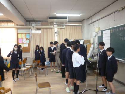 1・2時間目に1組と2組が、3・4時間目に3組と4組が漫才の練習やクラスでの発表をしました。