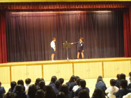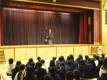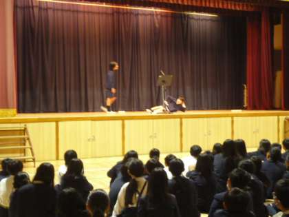 5時間目に、講堂で各クラスの代表3グループ(計12グループ)がみんなの前で漫才をしました。