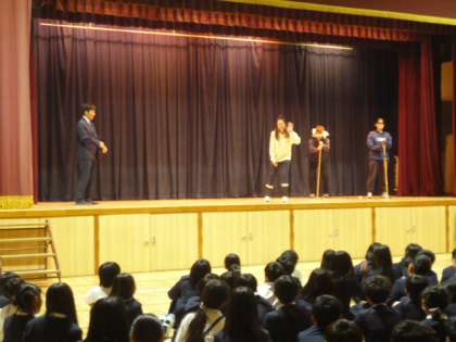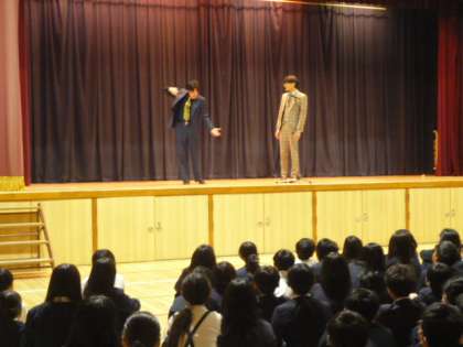 児童の漫才の後、サプライズとして6年生の先生たちが漫才(コント?)をしました。まさかのサプライズで、児童は先生たちの漫才(コント?)を楽しみました。
