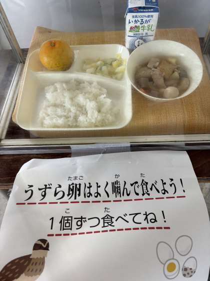 今日の給食では、鶏肉、うずら卵、ごぼう平天、じゃがいも、こんにゃく、厚揚げ、大根、にんじんが使われています。