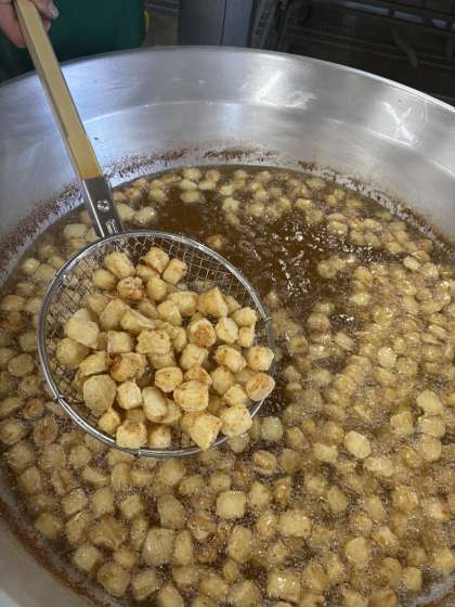 いかには、体を作るもとになる「タンパク質」が多く含まれています。今日の「いか天ぷら」は、いかに小麦粉とでんぷんで作った衣がついたものを、給食室で揚げています。