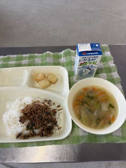 どのクラスもお代わりじゃんけんの声が響いていました。おかか菜っぱをご飯にかけて食べるとごはんが進みました。