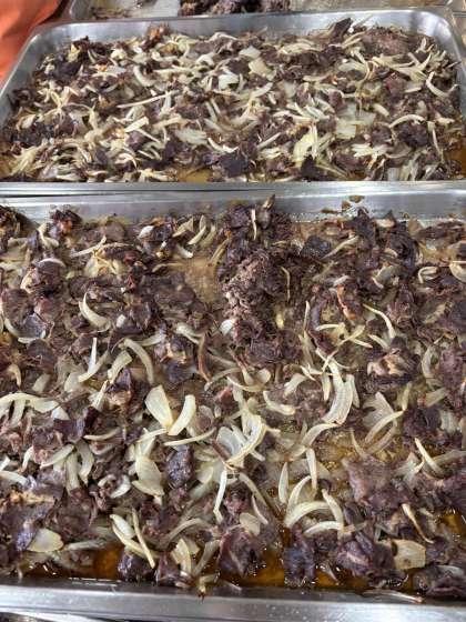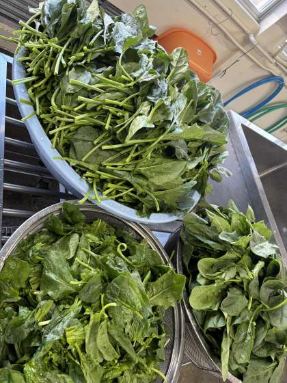 ほうれん草のおひたしは、24kgの大量なほうれん草をゆでて、砂糖、うすくちしょうゆを合わせて煮、ほうれん草にかけてあえて作りました。
