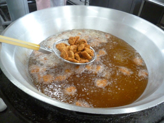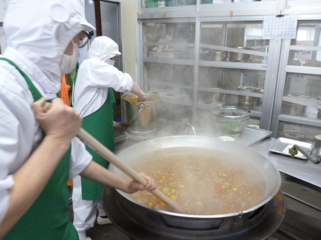 小学校の給食は大きな釜で作ります。