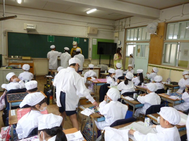 1年生が給食の準備をする時に、6年生が手伝ってくれています。
