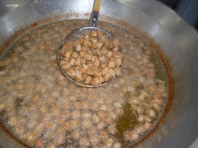 まぐろのオーロラ煮は、まぐろにでん粉をまぶし、熱した油で揚げました。しょうが汁、ケチャップ、砂糖、赤みそを合わせたタレにまぐろをからませて作りました。まぐろのオーロラ煮は、子どもたちに大人気の献立でした。