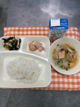 ★鶏肉のなにわ甘辛ソースかけ ★船場汁 ★小松菜の炊いたん ★ごはん ★牛乳 学...