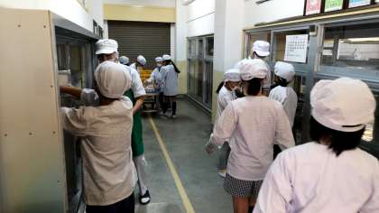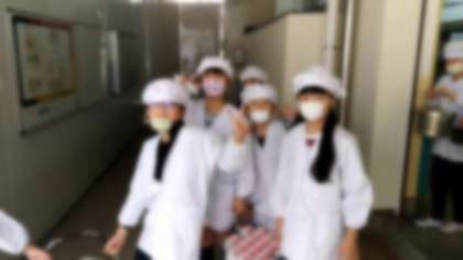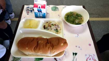今日の給食はパンです。リンゴと、グラタンとスープも美味しそうです。