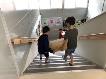 21日、防災意識の向上ということで、小松小学校のみんなにアルファ化米が配布されました。