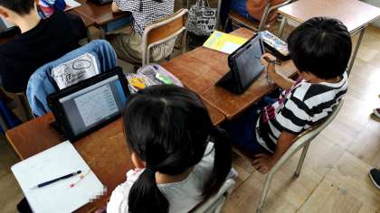 四年生の人が、算数の「四角形」の学習でタブレットを使っています。