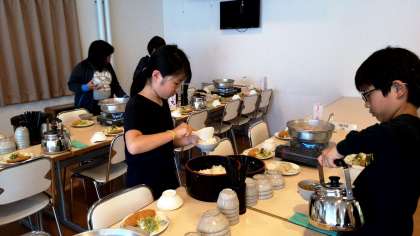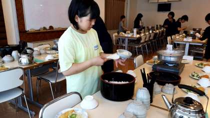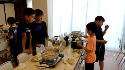 食事係が夜ご飯の準備をしています。