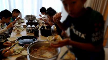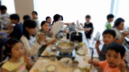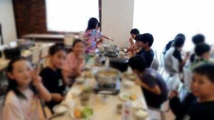 夕食です。奥の方の人はカメラよりも鍋かな〜?