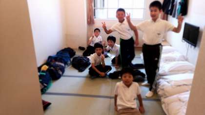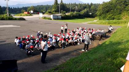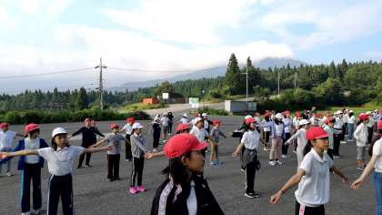 校長先生から「周りを見てみましょう。自然がたくさんですね。あそこの山は、兵庫県最高峰の氷ノ山です。」
