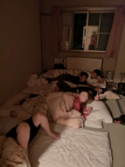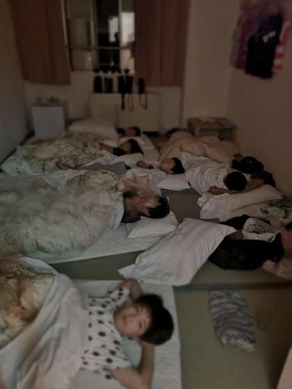既に寝ている人、カメラに気づいて寝ているふりをする人、「撮って」と言わんばかりにピースをしてくる人、