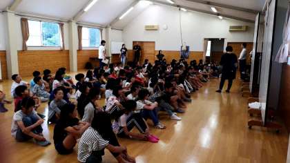 朝会は、外のコンディションがよくないので、多目的室で行いました。