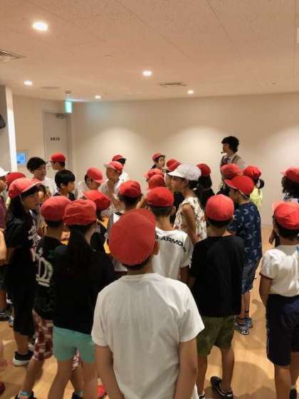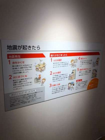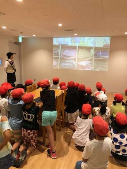 地震が起きたらどんなところが危険かを学んでいます。みんな真剣な表情で見ています。