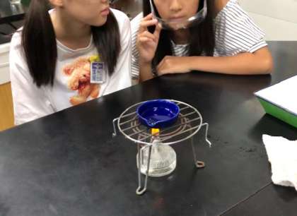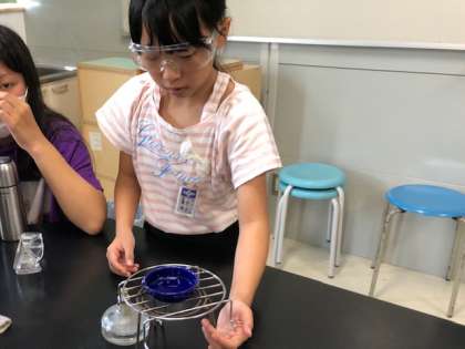 火を使って溶けた後の水溶液を熱して、何が残るか調べています。