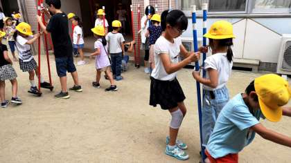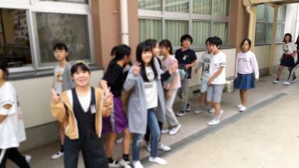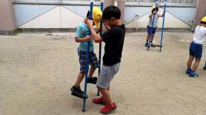 竹馬の様子を見ていた女の子たちがピースしてきました。
