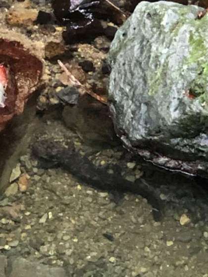 歩いている道中にこんな生き物が。この時間に見れるのが奇跡的だそうです。オオサンショウウオです。