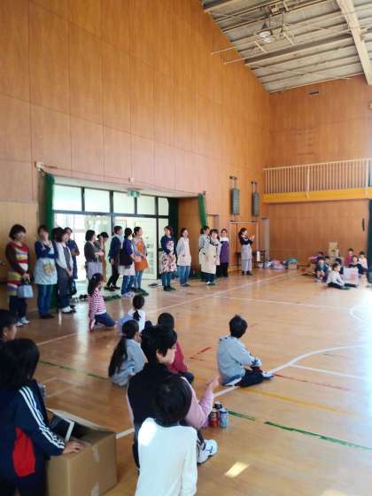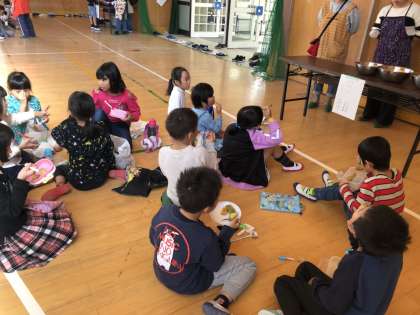 自分たちで収穫したおいもや、地域の方から頂いたおいもをサポーターのお母さんたちが、ふかしいもにしてくださいました。そのおいもを食べて楽しいおいもパーティをすることができました。
