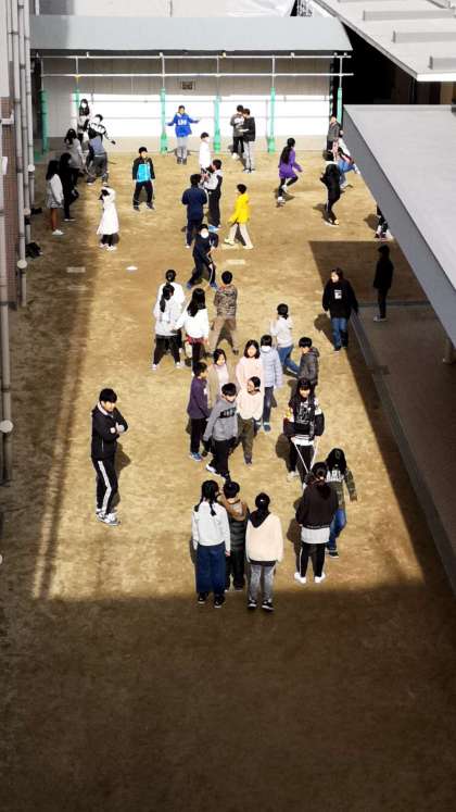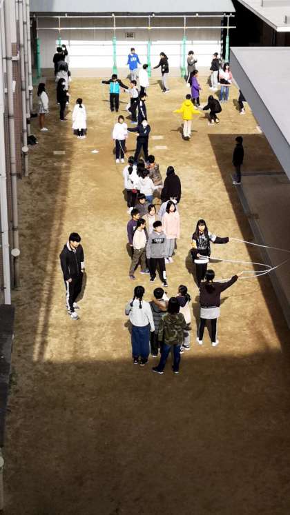 休み時間に、中庭で大縄とびをしているクラスがありました。