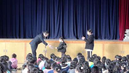 さて、朝会では二人の児童が表彰されました。