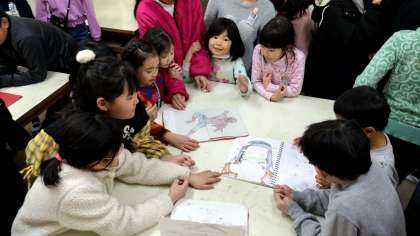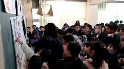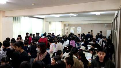 昼休みにマンガ絵画クラブが作品展をしました。図工室は超満員。