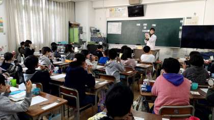 歯科衛生士、歯科医の方がお越しになり、四年生に歯磨き指導とフッ化物塗布をしてくださいました。