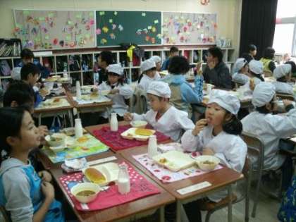 給食は、クラスの半分の子どもたちが入れ替わって食べる交流給食でした。1年生は、普段とは違う雰囲気にびっくりして、いつもより早く食べ終わっていました。