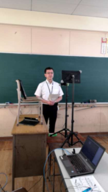 写真のように、Webカメラとパソコンを使って、本部から各教室へと生の映像や録音した校歌などを送ります。
