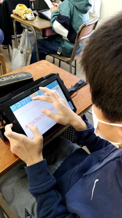 六年生が、タブレットで「町の幸福」についての発表ノートをつくっています。