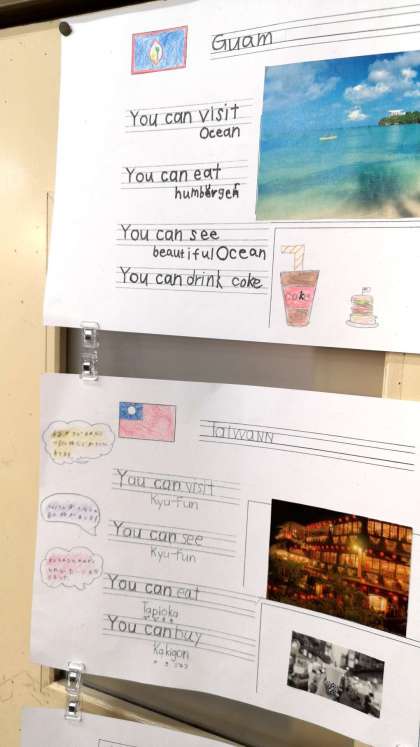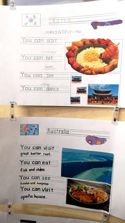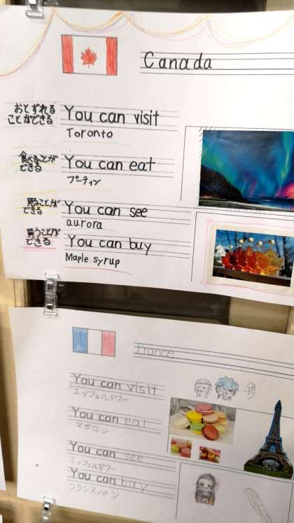 五年生の教室には、グループで調べた国の紹介が貼ってありました。
