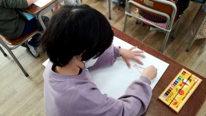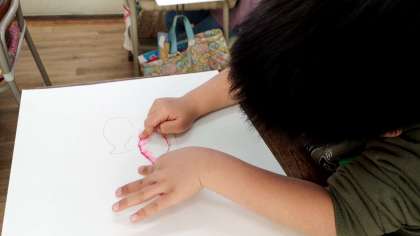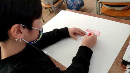 1年生がパスと自分の指を使って、お魚の絵を描いています。