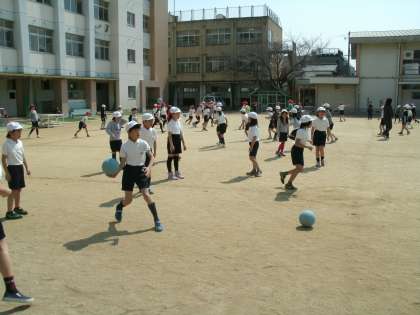 各チーム10人ぐらいに分かれての12チームでした。4月に比べると、ボールを投げたり、よけたりする力が伸びてきたことや、作戦を考えるようになるといった変化が見られました。