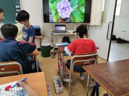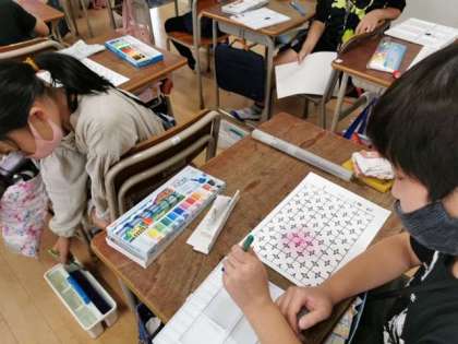 花の色を絵の具にある色ではなく、赤と青を混ぜて紫色を作ってぬってます。