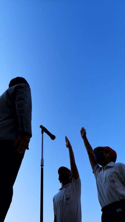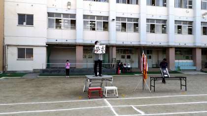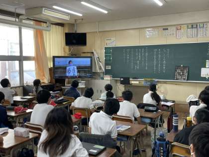 教室へはGoogle Meetで生配信し、運動場と全ての教室が繋がりました。写真は五年生の様子です。