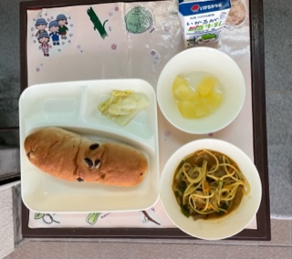 今日の献立は、カレースープスパゲッティ、キャベツのサラダ、りんご(カット缶)でした。