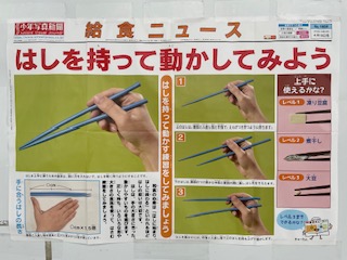 給食室前の掲示板には、箸を持って動かしてみようという掲示が貼られています。はしは、手の大きさによって持ちやすい長さがあります。はしを持って上手に動かす練習をおうちでもやってみましょう。
