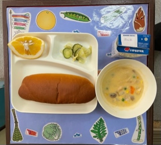 11日(水)の献立は、コーンクリームシチュー、キャベツときゅうりのサラダ、かわちばんかんでした。