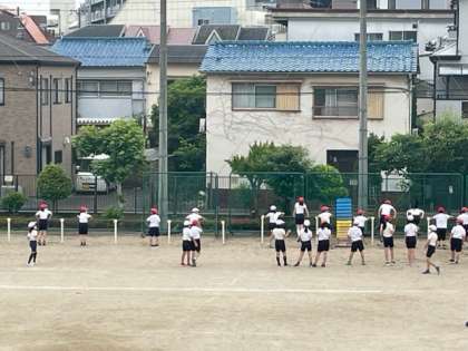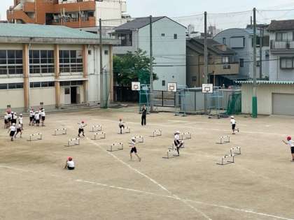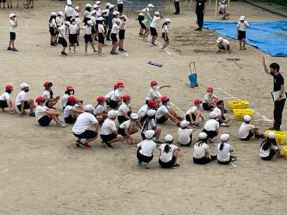 4年生が運動場で体育をしていました。運動場を4つにコーナー分けし、学級ごとにいろいろな運動に取り組みました。運動内容に合った場づくりが工夫されていました。