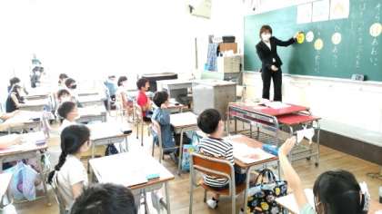 まず、第一弾として、1年で、研究授業を行いました。今日の学習は、「は」と「わ」。ことばとことばをつなげるときに使う「は」は、ワと読むことです。文章の終わりには、『。』をつけることも学習しました。