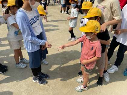集会委員会の子どもたちが遊び方やルールを説明した後、1年生と6年生が一緒に遊びました。