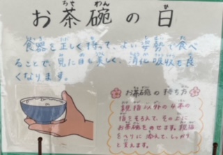 今日は月に一回のお茶碗の日で、ごはんをおわんに入れて手に持って食べる日でした。姿勢良く食べることで、消化吸収も良くなります。
