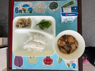すき焼き煮は「ふ」の個別対応献立で、小麦アレルギーの児童も食べられるように「ふ」を除去して提供しました。お肉の旨味が野菜やあつあげに染みていて、とてもおいしかったですね。