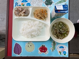 今日の給食は、豚肉の甘辛焼き、もずくとオクラのとろり汁、切干しだいこんのいため煮でした。